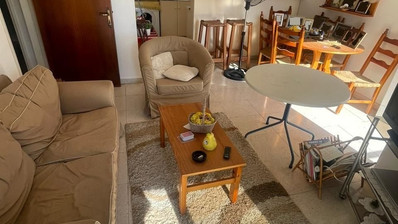 Apartment for sale in Oroklini, Larnaca. The property is fully furnished and consists of an open plan kitchen, living and dining area, A/C, kitchen appliances, two bedrooms, 1 bathroom, 1wc and veranda with barbeque and sea side view.