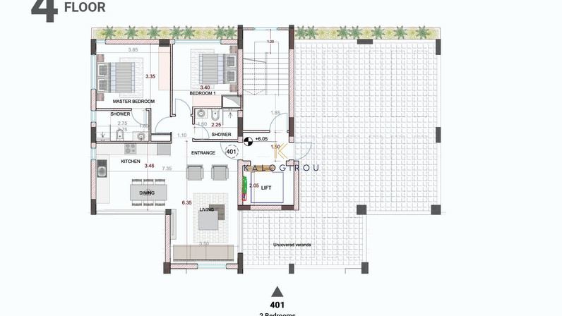 Penthouse for sale in Paphos, Neapolis area. The property is on the fourth floor, consists of open plan kitchen, living room, dining area, 2 bedrooms, 1 en suite shower, a main shower, 2 wc and large uncovered veranda. The property has access to a storage room and covered parking.