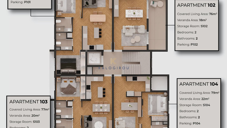 Apartment for sale in Aradippou area, Larnaca. The apartment consists of an open plan kitchen, living room, dining area, a main bathroom, two bedrooms, one of them is en suite with shower & wc, and a covered veranda. Moreover, the residents have exclusive right of use to a covered parking and storage room on the ground floor.