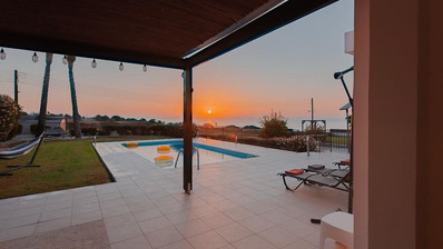 The house boasts a splendid outdoor space featuring a comfortable sofas and a table, perfect for savoring your coffee or meals. Situated in front of a sparkling pool, this idyllic setting offers breathtaking views of the sea, just around 80 meters away.