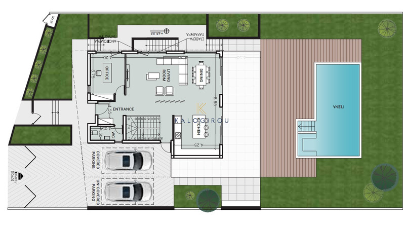 Luxury villa for sale in a prime location of Agios Tychonas, Limassol. The property consists of three levels. The ground floor consists of an open plan kitchen with living room and dining area, a guest W/C, an office. The upper floor consists of three bedrooms, two en – suite shower with W/C, while the master bedroom belongs an en – suite bathroom with W/C and Walk – In Closet. On the basement there are a gym room, astorages, a Laundry room, a changing room a main with W/C.