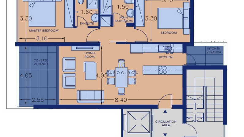 Two Bedroom Apartment in Mall Area, Larnaka. The apartment consists of an open plan kitchen with dining room and living room. It also belongs two bedrooms, one en – suite shower with W/C in the master bedroom and one main bathroom with W/C. The apartment has 82sq.m of internal covered area and 16sq.m of covered verandas.