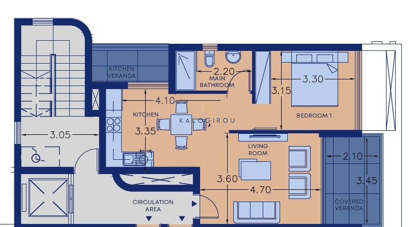 One Bedroom Apartment in Mall Area, Larnaka. The apartment consists of an open plan kitchen with dining room and living room. It also belongs one bedrooms, one main bathroom with W/C. The apartment has 56sq.m of internal covered area and 14sq.m of covered verandas.