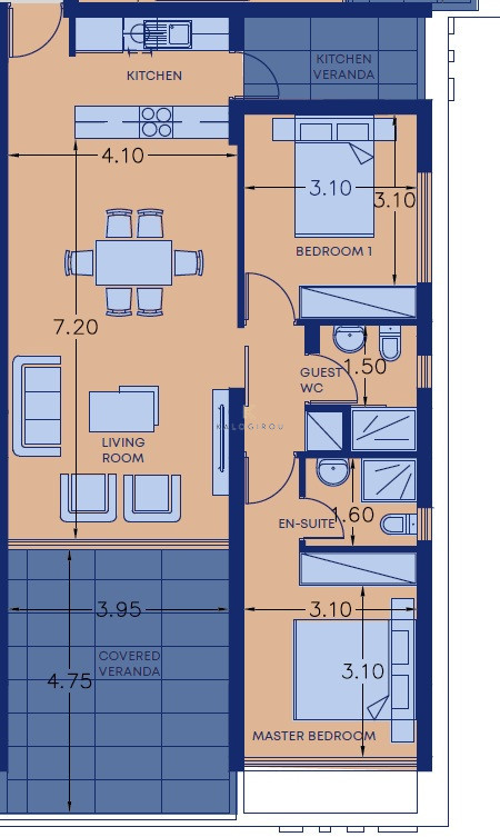 Two Bedroom Apartment in Mall Area, Larnaka. The apartment consists of an open plan kitchen with dining room and living room. It also belongs two bedrooms, one en – suite shower with W/C in the master bedroom and one main shower with W/C. The apartment has 84sq.m of internal covered area and 25sq.m of covered verandas.