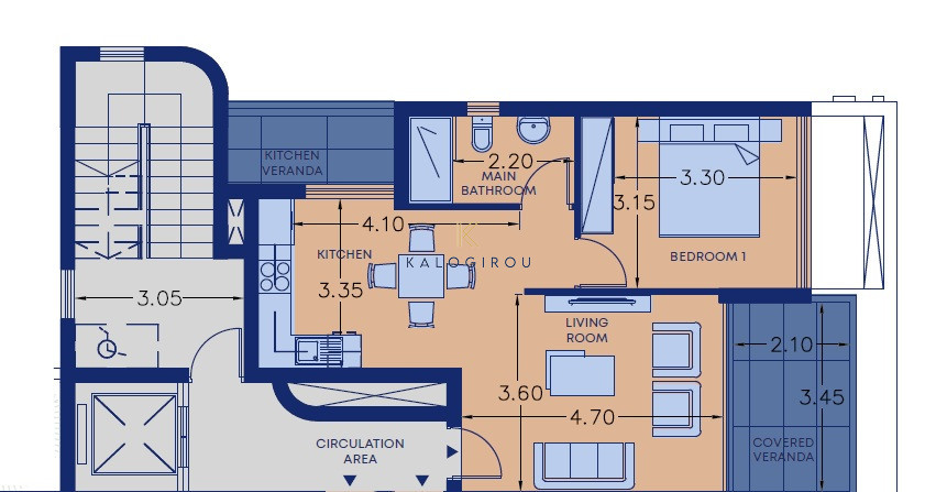 One Bedroom Apartment in Mall Area, Larnaka. The apartment consists of an open plan kitchen with dining room and living room. It also belongs one bedrooms, one main bathroom with W/C. The apartment has 56sq.m of internal covered area and 14sq.m of covered verandas.
