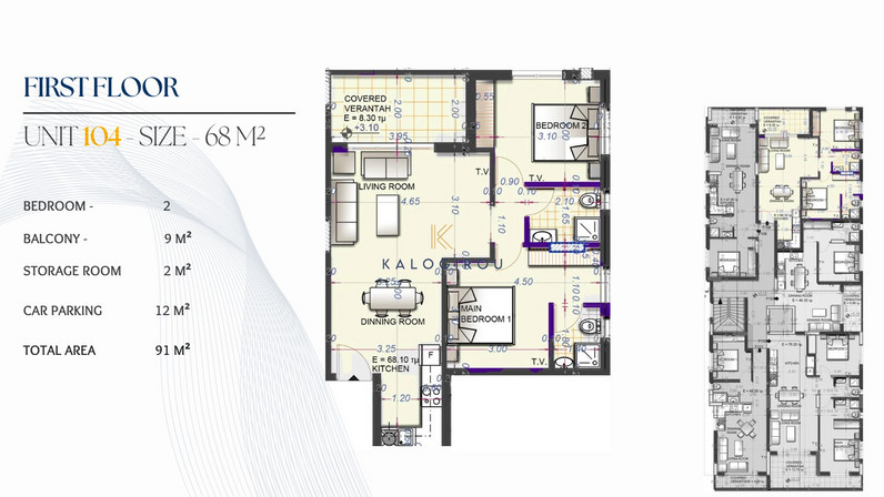 First floor apartment for sale in Kiti area, Larnaca. It consists of an open plan kitchen, living, dining area, two bedrooms, en suite master bedroom, a main shower room and covered balcony. In addition, the apartment has also access to an assigned storage room and covered parking.