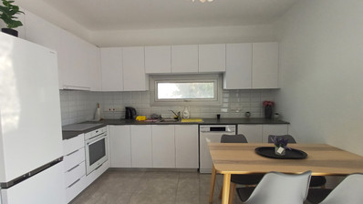 Apartment for rent in Krasas area, Larnaca. This amazing apartment comprises of an open plan kitchen/living/dining room, two bedrooms, family bathroom with shower and toilet, one en-suite shower in the master bedroom, full A/C split units, a large covered veranda overlooking a public green area and a large covered veranda at the back.