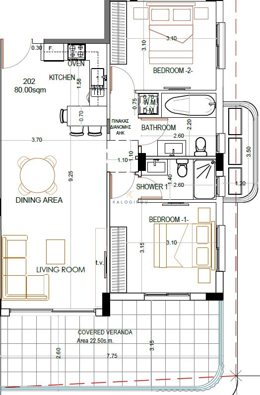 Lovely Two Bedroom Apartment for Sale in Krasas area, Larnaca. This amazing apartment consists of an open plan kitchen and living room with dining area, two bedrooms, one en-suite shower with W/C and a main bathroom with W/C. The property has 80sq.m of internal covered area and 23sq.m of covered veranda.