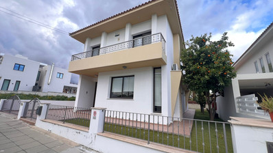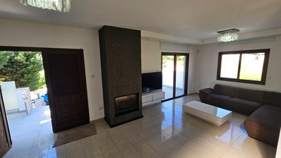 House for sale in Oroklini area, Larnaca. On the ground level, there is a beautiful and large entrance area, living room with fire place, dinning area, an office room, an open fully-equipped kitchen with an island, an additional space connected to the garage and a guest toilet.