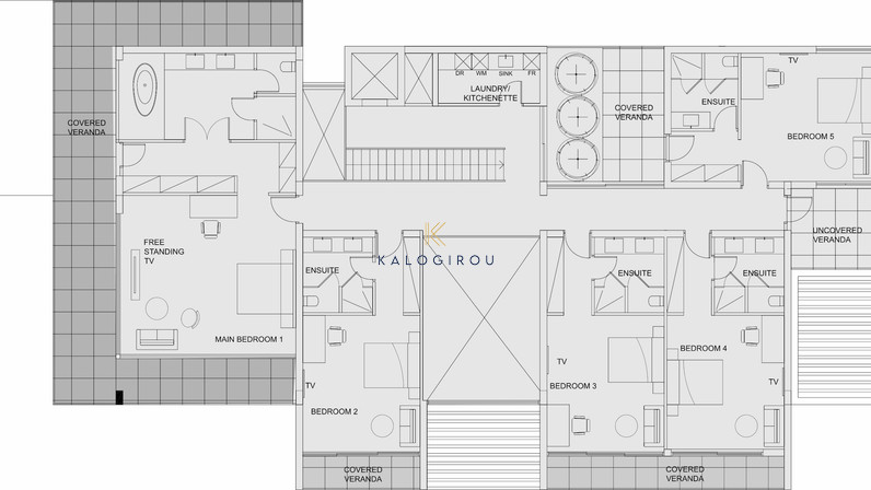 The first floor consists of five bedrooms, four of which are en suite, as well as a separate laundry room and multiple uncovered balconies offering open views.
