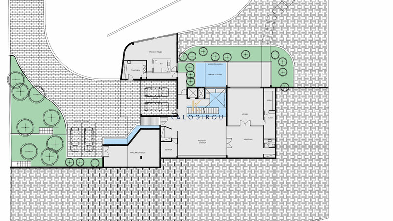 Villa for sale in the Kouklia area. The ground floor comprises a spacious living and dining area, a separate kitchen, an office, two bedrooms, a guest toilet, and an impressive indoor waterfall feature that enhances the aesthetic of the space.
