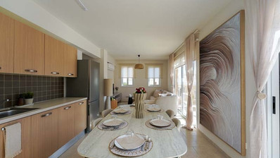 Apartment situated on the second floor for sale in Tersefanou area, Larnaca. It consists of open plan kitchen-living-dining area, two bedrooms-both with veranda access, one bathroom, and main large veranda. The apartment has also covered parking.