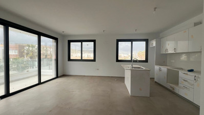 Brand new apartment for sale in Oroklini, Larnaca. It is on the third floor & consists of an open plan kitchen- living-dining area, a main bathroom with shower, two bedrooms-one of them en suite, covered veranda and roof garden with sea view. The apartment has allocated covered parking, storage.
